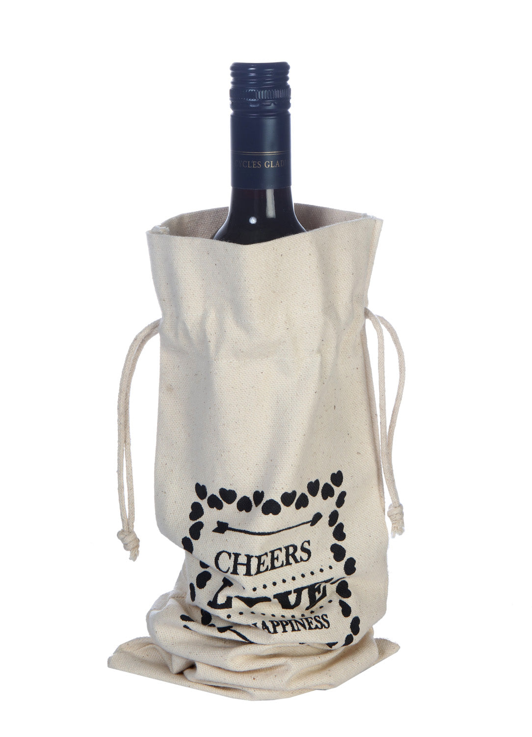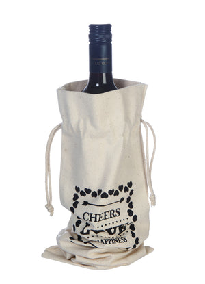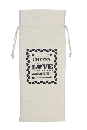 Individual Addon DiscountsShare the gift of joy with this "Cheers, Love and Happiness" canvas wine bag. Crafted from durable natural canvas with a romantic, heart-themed design, this reusable drawstring bag is the perfect way to gift wine, champagne, or sparkling beverages for any celebration of love.