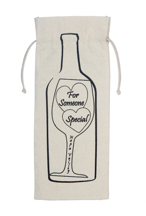 Heartfelt Design: Features a black printed illustration of a wine bottle and glass with two heart shapes, carrying the message "For Someone Special – Napa Valley."