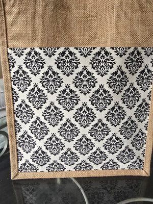 Individual Addon DiscountsElevate your everyday carry with this chic and timeless jute tote, featuring a classic black damask floral print. The natural jute body contrasts beautifully with the elegant patterned front panel, making it a refined and versatile accessory for shopping, work, or casual outings.