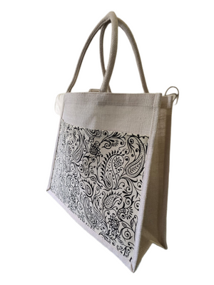 Individual Addon DiscountsAdd a touch of timeless elegance to your eco-friendly lifestyle with this beautiful jute fashion bag. Featuring a classic black paisley print on a neutral background, this versatile tote is perfect for daily errands, shopping, or as a stylish and sustainable gift.
