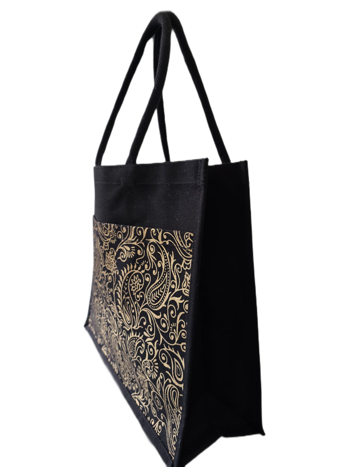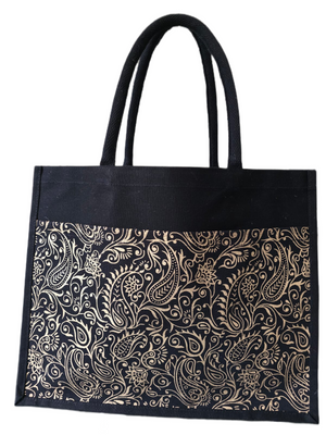 Individual Addon DiscountsElevate your everyday style with this sophisticated black jute fashion bag. Featuring an elegant golden paisley print, this eco-friendly tote blends a timeless motif with a modern color palette, making it the perfect statement accessory for work, shopping, or special events.
