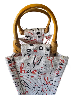 Individual Addon DiscountsCelebrate in style with this festive and eco-friendly jute wine bag. Adorned with cheerful red and black "Cheers" text, this bag is a perfect and sustainable way to gift your favorite bottle of wine or champagne for birthdays, holidays, or any special occasion.